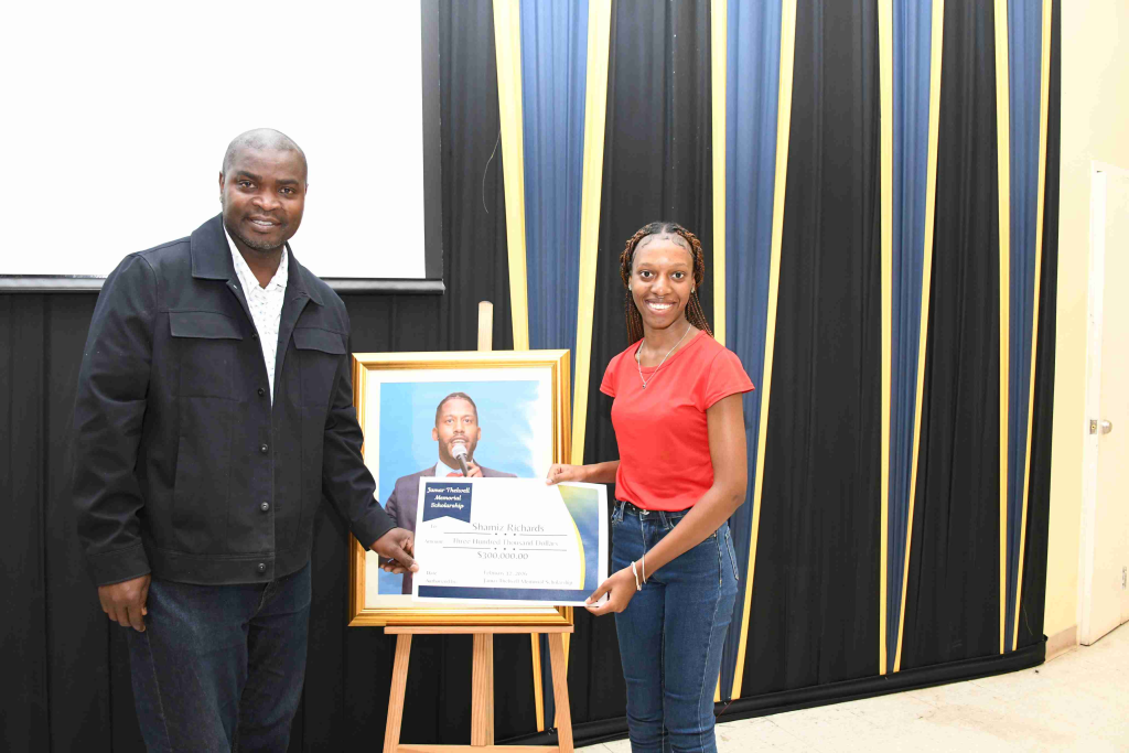 Miss Shamiz Richards, first-year Bachelor of Arts in Communication Arts and Technology (BACAT) student, Faculty of Education and Liberal Studies, UTech, Jamaica, receives the 5th Annual Jamar Thelwell Memorial Scholarship from Mr. Steadman Noble, brother of the late Jamar Thelwell, during a special presentation ceremony at the Shared Facilities Building, UTech Papine Campus, on February 12, 2026. Valued at $300,000, the scholarship supports aspiring communication arts students in achieving their academic and career goals.