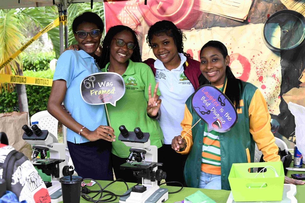 Students of the Faculty of Science and Sport share a photo at their booth during the 2026 staging of UTech, Jamaica’s President’s Knights Day.