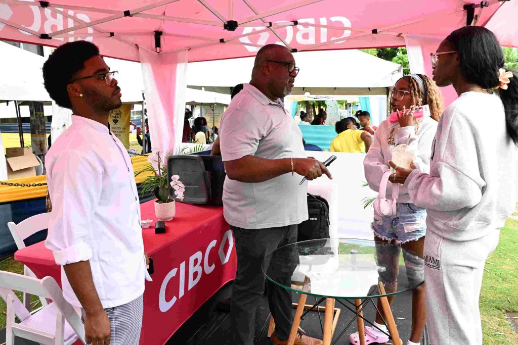 Students engage in conversation with a representative from CIBC FirstCaribbean International Bank during the President’s Knights Day 2026 activities at the University of Technology, Jamaica.